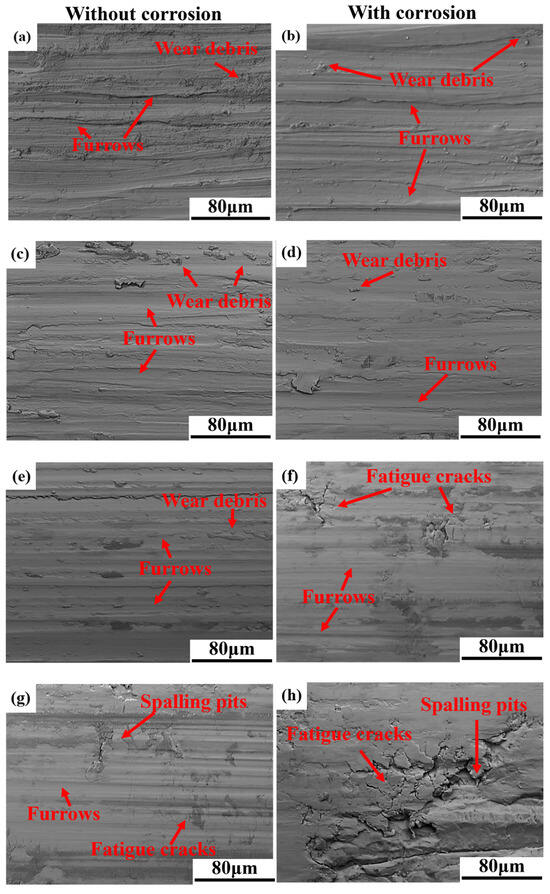 As the corrosion-wear volume of Cr5 is lower than its wear volume, which may be related to the oxide film. First, the oxides have two effects on the wear volume [34]. Positive aspects: the lubrication of oxides could reduce the wear volume. Negative aspect: the oxides are easily removed by the tangential forces leading to an increase in the wear volume. Second, the formation of oxide film could be promoted by the solution corrosivity. The positive effect of the oxide film on the wear volume outweighs its negative effect, resulting in a lower corrosion wear volume for Cr5 as compared to its wear volume. The opposite is true for TC4, which may be due to the thicker and less dense oxide layer of TC4 compared to Cr5. The corrosion-wear volume of Cr10 and Cr15 is larger than their wear volume, which mainly originates from the worsening fatigue spalling. Moreover, the promotion of corrosive behavior on the crack formation in Cr15 is more pronounced for its poor toughness and corrosion resistance. As a result, the wear volume increment of Cr15 is greater than that of Cr10.