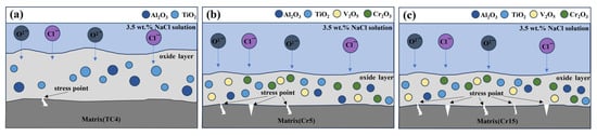 The studies on the effect of V, Al and Cr on the corrosion behavior of Ti alloys have shown that V2O5, Al2O3 and Cr2O3 doping in TiO2 oxide film could enhance the densification of the composite oxidized film [27,28,29,30]. Thus, the (AlTiV)100−xCrx alloy has a better corrosion resistance than TC4. However, the excessive internal stresses in the matrix resulted in the failure to form a stable passivation film on the surface of the AlTiVCr alloy. Moreover, the corrosion resistance of AlTiVCr decreases gradually due to the increase of internal stress with the increase of Cr content. The corrosion behavior of AlTiVCr alloys in NaCl solution could be influenced by the combination of stress corrosion and pitting. Thus, it is exacerbated by the increasing internal stress induced by the increase of Cr content and the introduction of chloride ions. The corrosion mechanism diagram is shown by Figure 8.