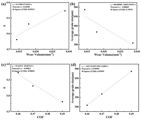 Plot of wear volume, steady state COF versus δ value, and average grain size for AlTiVCr alloys: (a) δ-wear volume; (b) average grain size-wear volume; (c) δ-COF; (d) average grain size-COF.
