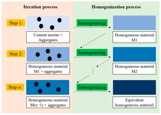 The iterative method is used to decompose the inclusions into a number of multiple copies and add them to the matrix unit one by one, and the homogeneous body formed after adding the matrix unit is used as the new matrix for the next iteration until all the inclusions are added. In contrast to the iterative method, the direct method, in which all inclusions are added to the matrix at once to form a homogeneous body, is used [35]. The iterative method, as an efficient means, especially in the context of the development of modern computer technology that provides good conditions for its use, has been widely used in the direction of engineering mathematical problems related to the computational. This method is often used in the direction of the study of the fine mechanics of concrete, and its performance is excellent when combined with Mathematica software for programming and numerical simulation, which can greatly improve the accuracy of numerical simulation. The application of the iterative method to concrete research is shown in Figure 1.