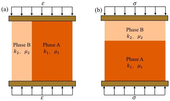 Voigt proposed the equal-strain model to predict the elastic modulus of composite materials, with the prerequisite assumption that both phases undergo the same strain during deformation [43]. As shown in Figure 2, under this model, the equivalent elastic modulus of the composite material is given by the following formula: