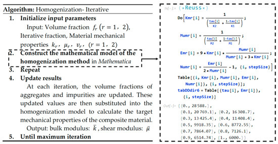 This study implements the homogenization method and an iterative enhancement of the homogenization approach using Mathematica to numerically predict the effective mechanical properties of composite materials. The iterative method improves the traditional homogenization approach by continuously updating the volume fractions of constituent phases, enabling the model to more accurately reflect changes in the material’s microstructure and thereby improve simulation accuracy. The detailed implementation process is illustrated in Figure 3.
