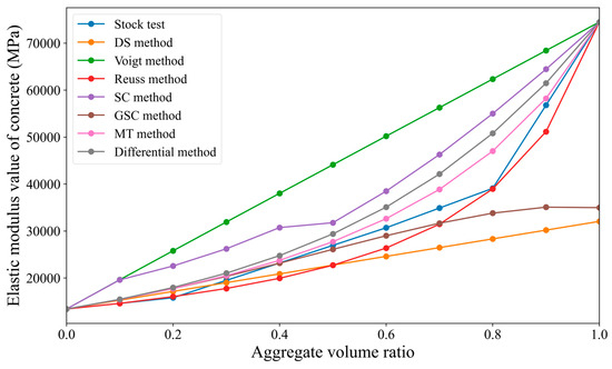 When studying the related parameters of concrete materials, researchers both domestically and internationally often use Stock test data [45] as a reference. Therefore, in this paper, Stock test data are also selected for comparison with the effective elastic modulus of concrete predicted using various homogenization methods, in order to further analyze the application scope and advantages and disadvantages of different homogenization methods.