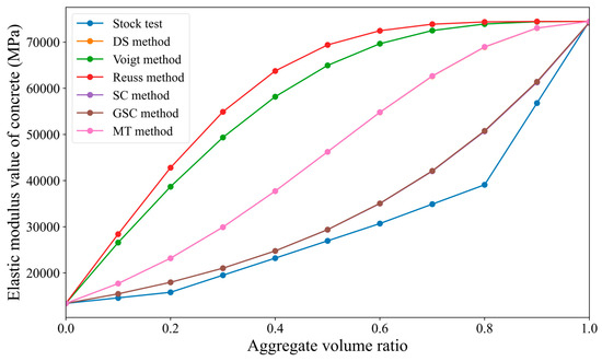 The parameter values of the concrete’s micro-scale two-phase materials listed in Table 1 are substituted into the different homogenization methods mentioned earlier to calculate the predicted simulation values of the concrete’s effective elastic modulus. The calculations are assisted by Mathematica software. To differentiate the influence of the direct method and the iterative method on the predicted simulation values of the effective elastic modulus, the iterative method and the direct method are calculated separately and then compared. It should be noted that in this section, all the micro-mechanics methods are based on the direct method, and the results obtained by combining micro-mechanics and iterative methods will be also discussed.