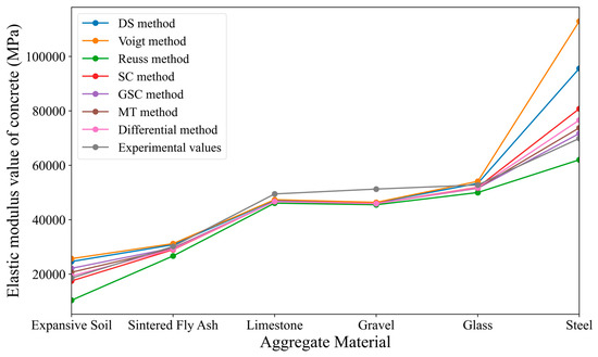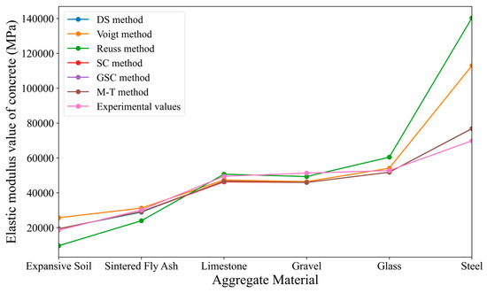 As in the previous section of this study, the aggregate and cement matrix test values listed in Table 4 are substituted into the various homogeneous methods mentioned earlier. At the same time, the iterative method principle is applied when inputting the parameters, that is, the inclusion unit is decomposed into several parts, which are then added to the matrix unit one by one. The homogeneous body formed after adding the matrix unit is used as the new matrix for the next iteration, until all inclusions are incorporated. The final predicted results using the micromechanical method are shown in Table 7, along with the known case study results. To more intuitively reflect the variation trend of the concrete elastic modulus with respect to the aggregate volume ratio, the values in the table are plotted as a line graph, as shown in Figure 7. It should be noted that the horizontal axis in Figure 7, labeled 1 to 6, represents six types of aggregate materials: expansive clay, sintered fly ash, limestone, gravel, glass, and steel, arranged in ascending order of their elastic modulus values.