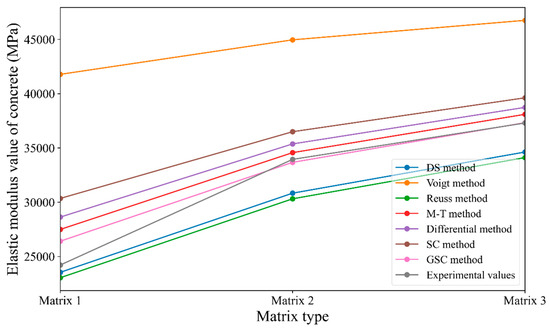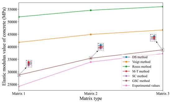 Similar to Section 3.2.1, the reference values from Table 9 are substituted into the various micromechanical methods mentioned earlier to obtain the predicted values, which are then compared with the known experimental values from the case study. This comparison helps assess the prediction accuracy of each micromechanical method. The predicted and experimental values are shown in Table 10. Additionally, based on the data in Table 10, a line graph (Figure 8) is created to more intuitively reflect the prediction accuracy of the different micromechanical methods. In Figure 8, the symbols Matrix 1, Matrix 2, and Matrix 3 on the horizontal axis represent three different cement matrix phases, with corresponding elastic moduli of 14.66 GPa, 20.34 GPa, and 23.56 GPa, respectively.
