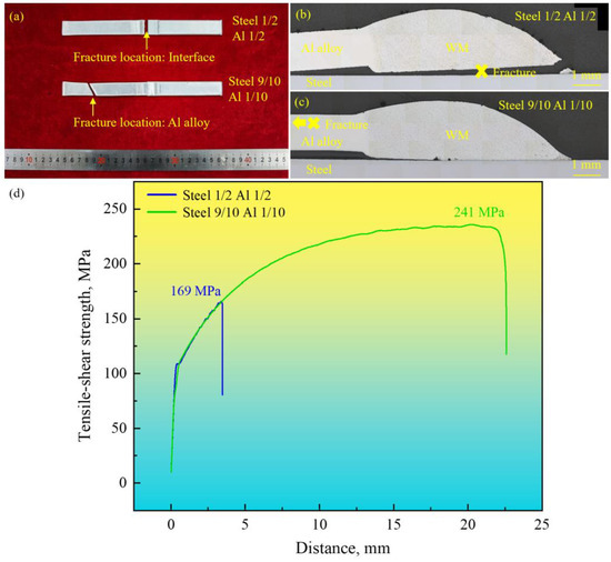 Figure 2 displays the tensile–shear test results of steel–Al welded joints prepared with different laser spot positions. When the laser spot position was 50/50 (steel–Al), the joint fractured at the interface (see Figure 2b). The corresponding tensile–shear strength was only 169 MPa (see Figure 2d). When the laser spot position was 90/10 (steel–Al), the joint failed in the Al alloy (see Figure 2c). The specimen strength increased to 241 MPa (see Figure 2d). The joint property could be dramatically improved as the proportion of the laser spot on the steel BM increased from 50% to 90% according to the test results. Compared with other investigations with joint strengths of 210 MPa, 142 MPa, and 227 MPa [24,25,26], the strength of 241 MPa of the steel–Al joint prepared with the laser spot position of 90/10 (steel–Al) was satisfactory in this work.