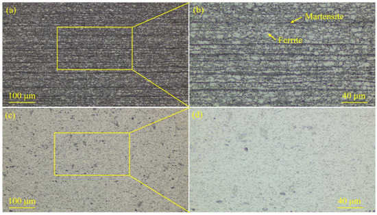 The metallographic microstructure of the steel BM (DP780 steel) and the Al alloy BM (5754 Al alloy): (a,b) the metallographic microstructure of the steel BM; (c,d) the metallographic microstructure of the Al alloy BM.