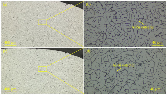 The metallographic microstructure of the weld seam of the steel–Al welded joints prepared with different laser spot positions: (a,b) the metallographic microstructure of the weld seam of the steel–Al welded joint corresponding to the laser spot position of 50/50 (steel–Al); (c,d) the metallographic microstructure of the weld seam of the steel–Al welded joint corresponding to the laser spot position of 90/10 (steel–Al).