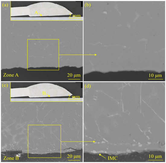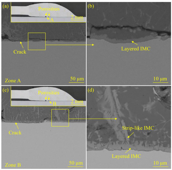The interface morphology of the welded joint prepared with the laser spot position of 50/50 (steel–Al): (a) the microstructure details of zone A, (b) the local enlarged image of zone A, (c) the microstructure details of zone B, and (d) the local enlarged image of zone B.