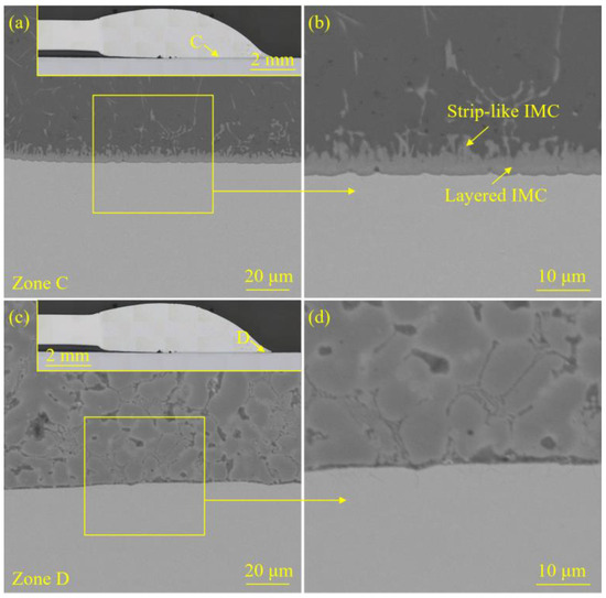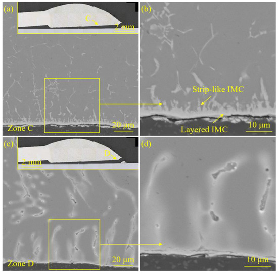 The interface morphology of the welded joint prepared with the laser spot position of 50/50 (steel–Al): (a) the microstructure details of zone C, (b) the local enlarged image of zone C, (c) the microstructure details of zone D, and (d) the local enlarged image of zone D.
