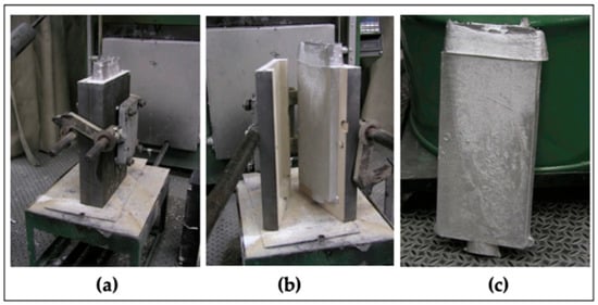 Figure 1. (a) The shape of the metallic mold used, (b) the casting inside the mold, (c) the final casting (103 mm in length, 41 mm in width, and 33 mm in thickness) [16].