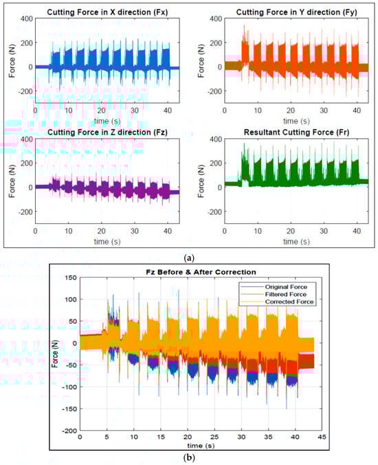 Figure 3. (a) Variation in cutting forces as a function of the cutting time: Fx, Fy, Fz, and Fr for the base alloy. (b) Cutting forces for the Fz component before and after correction.