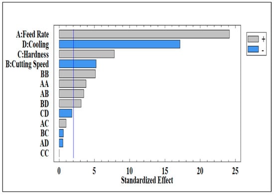 In the present study, the analysis of variance (ANOVA) was used to determine statistically significant cutting factors in the dependent machining variables studied. It involves studying the variability due to the difference in the effects of different factors and their levels. The significance of the factors was determined via the comparison of the F-ratio between them with a p-value below 0.05 (95% confidence level). Only significant factors and their interactions were considered in the analysis [18].