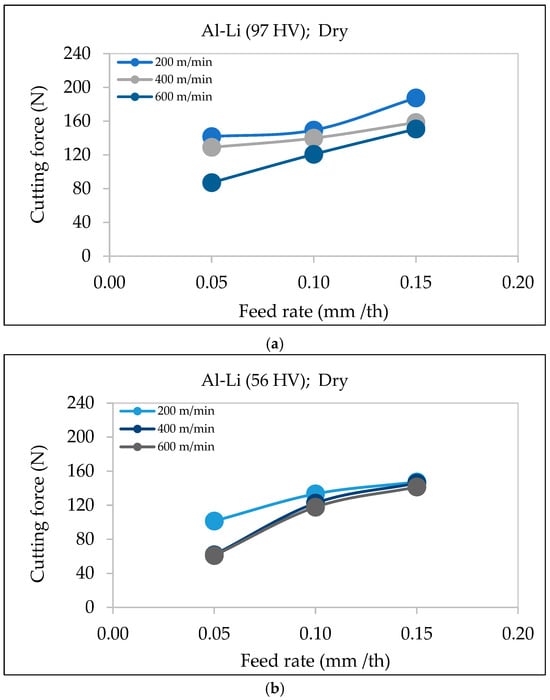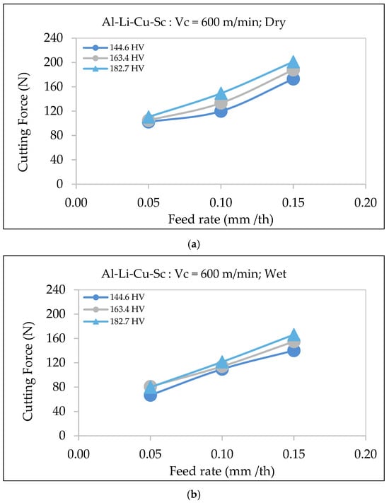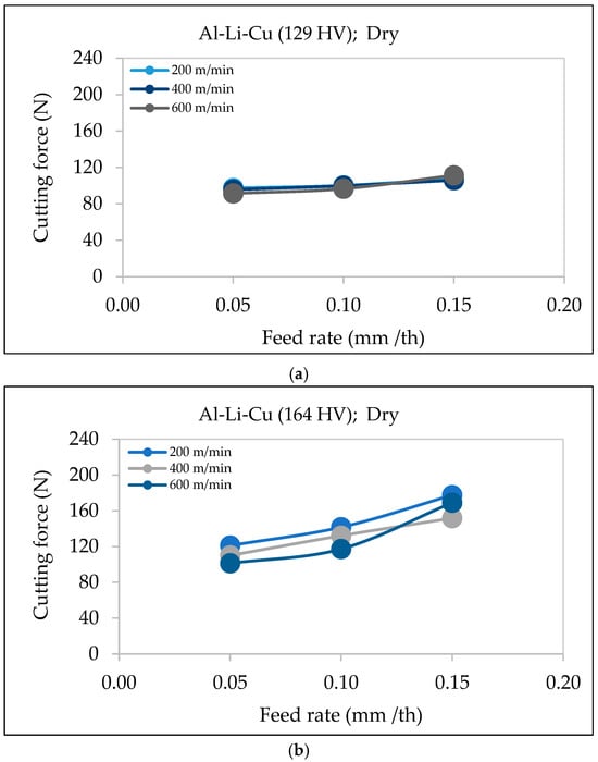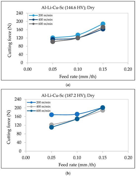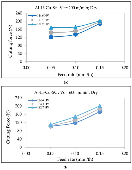 Figure 10. Variation in cutting force as a function of feed rate during dry machining of Al-Li-Cu-Sc alloys of different hardness: (a) cutting speed = 200 m/min, (b) cutting speed = 600 m/min.