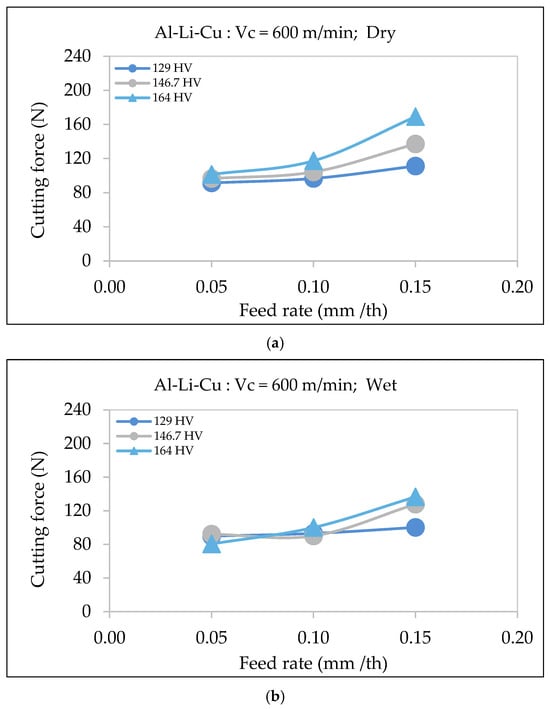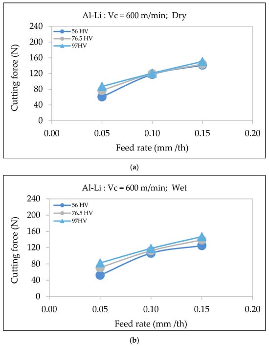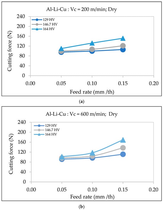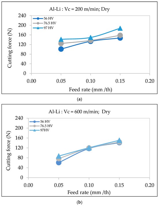 Figure 8. Variation in cutting force as a function of feed rate during dry machining of Al-Li alloys of different hardness: (a) cutting speed = 200 m/min, (b) cutting speed = 600 m/min.
