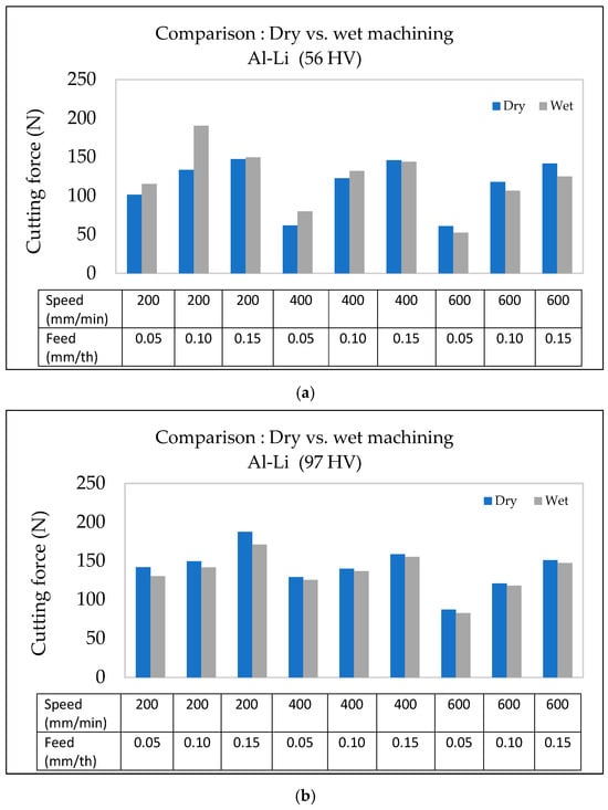 Figure 14. Comparison of surface roughness as a function of feed rate and cutting speed in Al-Li alloys under dry vs. wet machining conditions: (a) 56 HV, (b) 97 HV.