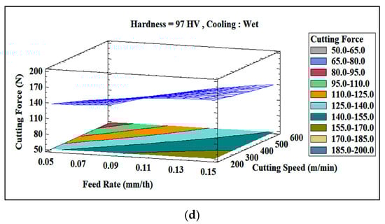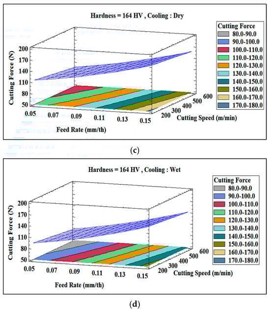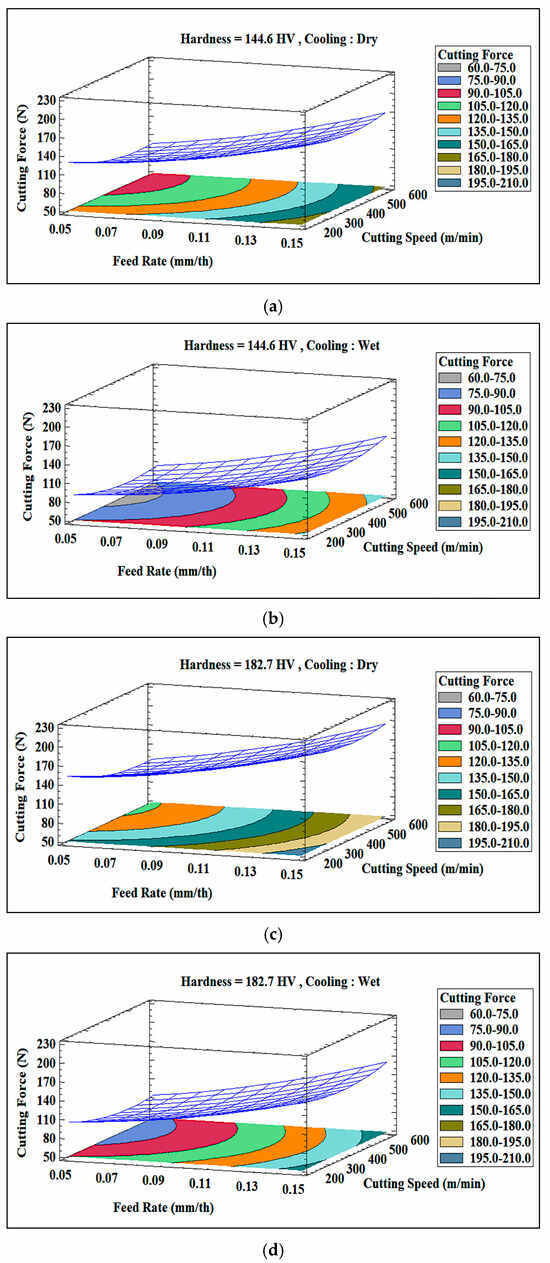 Figure 17. Three-dimensional surface plots of cutting force Rt obtained for Al-Li-Cu alloys exhibiting hardness values of (a,b) 129 HV, (c,d) 164 HV under (a,c) dry, and (b,d) wet machining conditions.