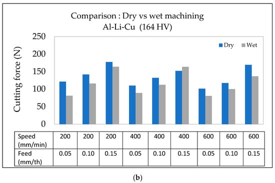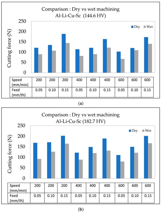 At higher feed rates (0.15 mm/th), wet machining lowers the cutting force, as seen from Figure 13b. This reduction can be attributed to the cooling fluid’s ability to decrease friction, minimize heat generation, and reduce tool wear, aligning with previous findings by Boswell et al. [35] and Jebaraj et al. [36]. Furthermore, lubrication helps stabilize the microstructure of Al-Li-Cu-Sc alloys by preventing thermal degradation and localized softening, which is particularly crucial in alloys with higher hardness.