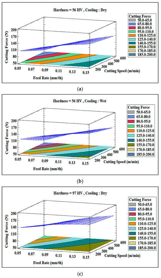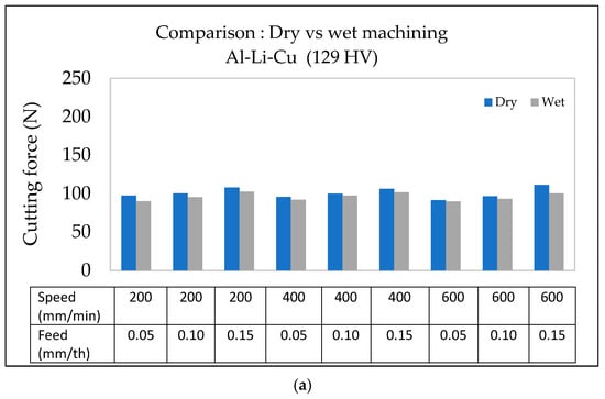 Figure 18 demonstrates how the cutting forces are impacted significantly by the interactions among the cutting parameters of feed rate and cutting speed, the alloy hardness, and the cooling mode during machining in the case of Al-Li-Cu-Sc alloys. Figure 18a,b show these interactions for alloys with hardness levels of 144.6 HV and 182.7 HV, respectively.