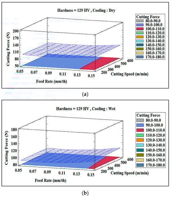 The 3D plots in Figure 17 further demonstrate that the cutting force increases more sharply with the hardness at higher feed rates. Wet machining notably dampens this effect for the harder (164 HV) alloy, illustrating the role of the cooling fluid in temperature regulation. For the softer (129 HV) alloy, however, the cooling impact remains relatively negligible due to the lower sensitivity of the alloy to thermal variations.