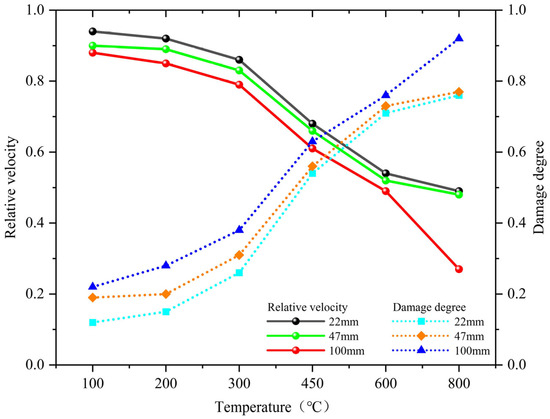 - The relative wave velocity of magnetite–serpentine radiation shielding concrete is inversely correlated with temperature and distance measurement, while the damage degree is positively correlated. The relative wave velocity of the 100 mm specimen at 800 °C was 0.27 and the damage degree was 0.92.