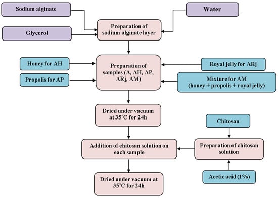 The samples were made from black locust honey, propolis tincture, and pure royal jelly. In order to obtain the mixture, 20 mL of propolis tincture, 5 g of royal jelly, and 35 g of honey were used. The obtained mixture was homogenized in a water bath for 20 min. The mixture was subsequently stored in a dark place in well-sealed containers. For the preparation of sodium alginate chitosan-films, first, the sodium alginate layers were prepared by dissolving honey/propolis tincture/royal jelly or the mixture in 50 mL of distilled water with 1 g of sodium alginate and 0.1 g of glycerol.