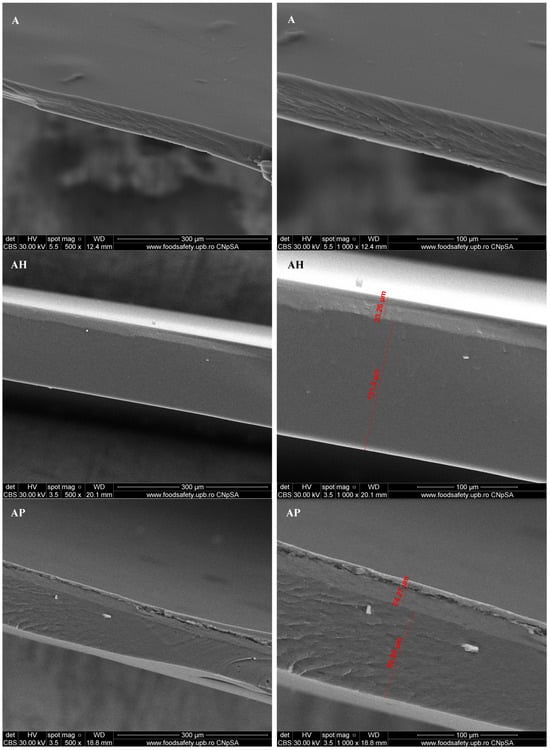 The SEM analysis of the sodium alginate–chitosan-based composites reveals distinct morphological differences across the various formulations. The control sample (A) exhibits a relatively smooth and compact structure, indicative of a well-formed polymeric blend matrix. The addition of honey (AH) appears to modify the surface slightly, resulting in a smoother texture with some minor porosity, likely due to the incorporation of organic components. Similarly, the sample containing propolis (AP) shows a rougher surface with visible granule-like structures (Figure 2), suggesting phase separation or aggregation of resinous particles [24].