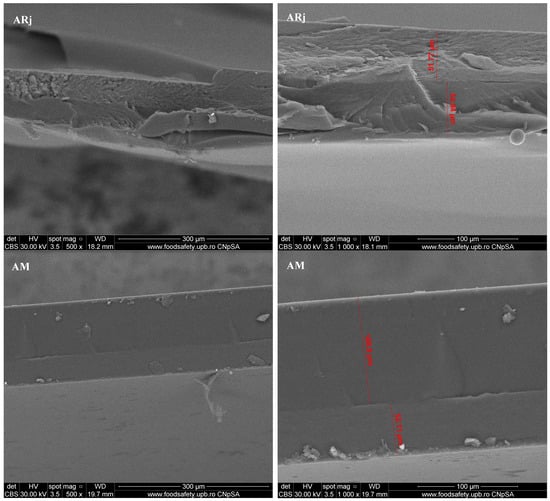 The SEM micrographs of the composite films revealed that the addition of bee products significantly influenced the surface morphology. Variations in roughness, porosity, and microstructural modifications were observed across different formulations, which can influence the microbial adherence capacity, requiring a separate study.