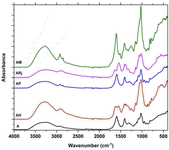 The 1153 cm−1 peak can be assigned to the C–O–C stretching vibration, while the peak from 1023 cm−1, visible in all samples, represents C–O stretching (from C–OH moiety). The 1153 cm−1 peak, together with the presence of 1254 and 1085 cm−1 peaks in AH, ARj, and AM, indicates the presence of an ester.
