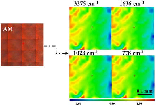 The FTIR maps at 3275 cm−1, 1636 cm−1, 1023 cm−1, and 778 cm−1 for the AM sample. Red areas indicate the highest absorbance, while blue areas correspond to the lowest absorbance.