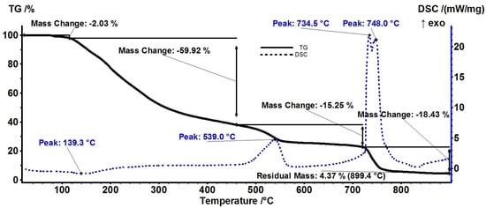 Thermal analysis was made with an STA 449C F3 system, TG-DSC (thermogravimetry-differential scanning calorimetry) from Netzsch (NETZSCH Gerätebau GmbH, Selb, Germany) between 20 and 900 °C in dynamic (50 mL/min) air atmosphere. The evolved gases were transferred through heated transfer line and analyzed on the fly with the help of an FTIR Tensor 27 from Bruker (Bruker Co., Ettlingen, Germany) equipped with an internal thermostatic gas cell.