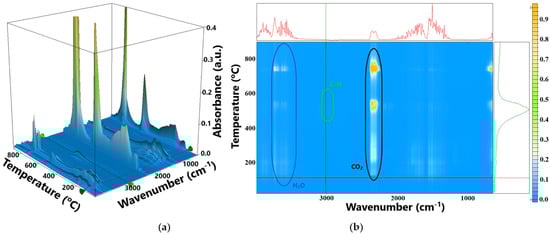 The FTIR 3D diagram for the gases evolved from thermal analysis of the AM sample (a); the 2D projections in the temperature/wavenumber plane (b); on top of 2D projection is the FTIR spectrum at the temperature of 112 °C, corresponding to the red line in the 3D diagram; at the right side of 2D projection is the evolving trace for the wavenumber 3010 cm−1 assigned to the Csp2-H vibration from the unsaturated hydrocarbon fragments, corresponding to the green line from the 3D diagram.
