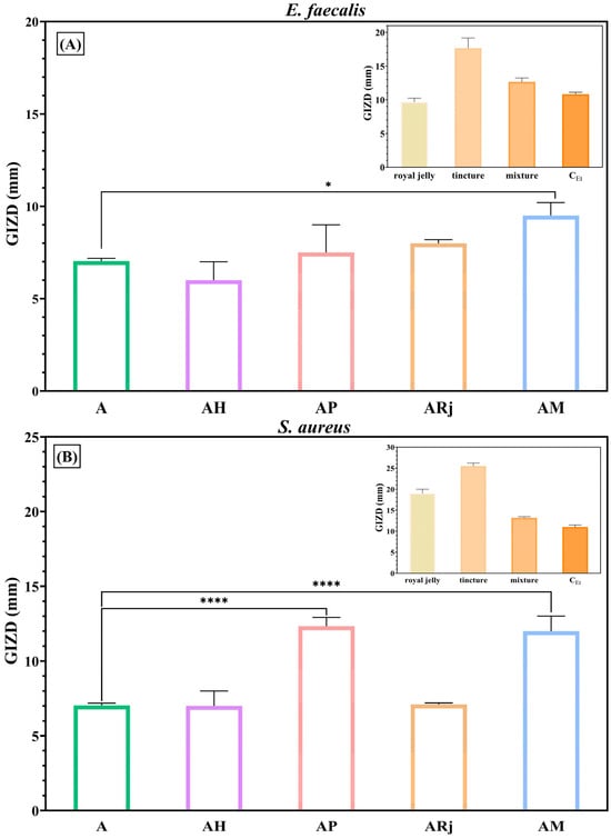 The alginate–chitosan films displayed a significant inhibitory effect against all tested Gram-positive bacteria. According to Figure 7A,B, the antibacterial patterns for E. faecalis and S. aureus are similar. Moreover, in the case of E. faecalis, the AM sample (alginate–chitosan film with mixture) exhibits a significantly higher inhibition zone than the A sample (pure alginate–chitosan film). In the case of S. aureus (Figure 7B), AP and AM samples exhibited the highest activity, with significant differences compared to the A sample (p < 0.0001). The antibacterial properties of these samples are attributed to the inhibitory effects of royal jelly and propolis tincture (see inset of Figure 7B). Likewise, Liang et al. [32] showed in their study that royal jelly enhances the antibacterial properties of the chitosan matrix.