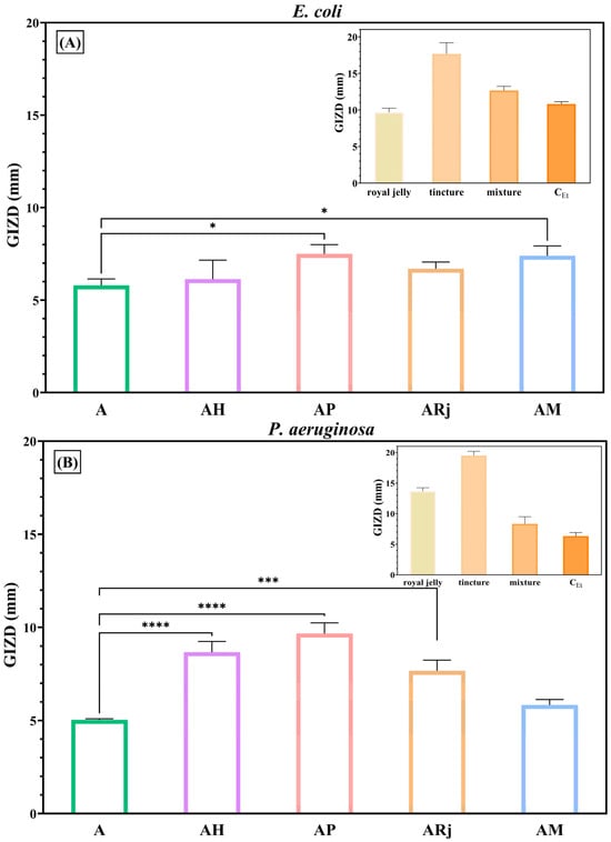 The significant impact of alginate–chitosan films against Gram-negative bacteria is shown in Figure 8. Moreover, the samples enriched with propolis tincture (AP) and mixture (AM) presented higher GIZDs than control, A sample. Furthermore, the alginate–chitosan films with honey, propolis tincture, and royal jelly (AH, AP, and ARj) exhibited the highest activity against P. aeruginosa, with GIZDs which ranging between 8 and 10 mm. We note that the evaluation of antimicrobial activity was carried out on all beekeeping products, but curiously, honey did not determine zones of inhibition for any of the tested strains. On the other hand, this did not happen in the case of samples with incorporated honey (AH) which exhibited good antibacterial activity, especially against P. aeruginosa and E. coli. To date, the exact antibacterial mechanism of honey is not fully understood, as it is highly complex and dependent on multiple constituents. In a previous report [33], Deng J.L. et al. found that manuka honey does not inhibit P. aeruginosa growth up to a concentration of 70%. In a comparative investigation of black locust, linden, and sunflower honey [34] against P. aeruginosa, H. influenzae, and H. parainfluenzae, the black locust honey was found to have the lowest antibacterial activity among tested varieties. In case of black locust honey, some of the antibacterial activity was attributed to the sugar content in a series of tests against P. aeruginosa and S. pneumoniae [34]. At the same time, the membrane degradation study indicates that higher water content leads to decrease in the antibacterial activity [34]. In another study made on eight honey types (acacia included), none of them had antibacterial activity against B. subtilis, and only three of them manage to inhibit growth of P. putida [35].