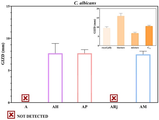 The composite films exhibited moderate activity against C. albicans (Figure 9). The samples A and ARj did not show the appearance of inhibitory zones. However, the films enriched with honey, propolis, or a mixture presented GIZDs between 7 and 8 mm.