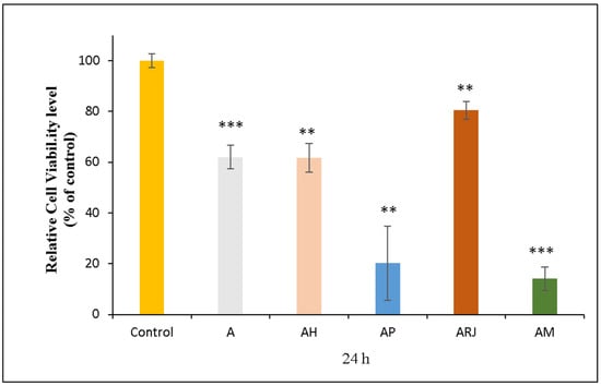However, AM (125%) exhibited an increase level of LDH, showing a substantial loss of membrane integrity. Moreover, these results are correlated to the cell viability results, indicating higher cytotoxicity compared to the control. More than that, in the case of a mixture of honey, propolis, and royal jelly, similar results regarding cytotoxicity have been obtained previously in the literature [51]. Their results revealed that this mixture induced the highest apoptotic effect on tumor hepatic cells.