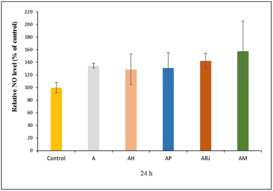Relative NO level of human gingival fibroblasts (HFIB-G cell line) cells measured by NO assay after 24 h of incubation with medium previously incubated for 24 h with the samples based on bee products: A, AH, AP, ARj, and AM. Results are expressed as means ± standard deviation (SD) (n = 3) and represented relative to the control (untreated cells).