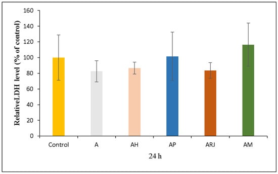 Relative LDH level of human gingival fibroblasts (HFIB-G cell line) cells measured by LDH assay after 24 h of incubation with medium previously incubated for 24 h with the samples based on bee products: A, AH, AP, ARj, and AM. Results are expressed as means ± standard deviation (SD) (n = 6) and represented relative to the control (untreated cells).