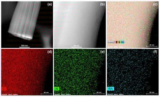 The morphology and Rh distribution of Rh/CTF-TPA were investigated by TEM (Figure 1 and Figure S4). As shown in Figure 1a, Rh/CTF-TPA exhibits a well-defined hollow tubular morphology, consistent with SEM observations. Remarkably, no discernible aggregation of Rh nanoparticles was observed in the high-magnification TEM image (Figure 1b) [32]. STEM-EDS elemental mapping analysis (Figure 1c–f) further confirmed the atomic-level homogeneous dispersion of Rh species across the support surface without apparent agglomeration, demonstrating the effective dispersion of Rh active sites through strong metal–support interactions.