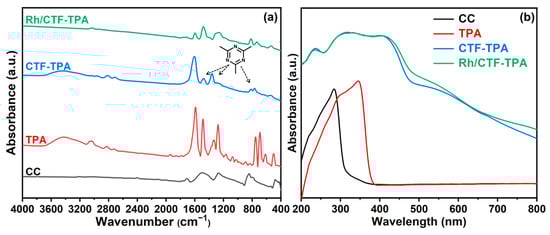 (a) FT-IR spectra and (b) diffuse reflectance UV−visible spectra of CC, TPA, CTF-TPA, and Rh/CTF-TPA.