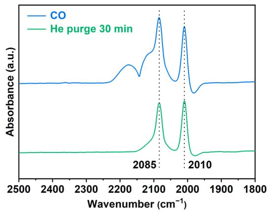 As shown in Figure 3, the CO adsorption FT-IR spectrum of Rh/CTF-TPA reveals two distinct peaks at 2085 cm−1 and 2010 cm−1 after He purging for 30 min to remove weakly adsorbed CO species [43]. These peaks are attributed to the symmetric and asymmetric stretching vibrations of gem-dicarbonyl species formed by CO adsorption on the active Rh metal sites, providing direct evidence for the single-atom distribution of Rh on CTF-TPA. Notably, no absorption peaks were detected in the 2050~2070 cm−1 range typically characteristic of linear CO adsorption on Rh nanoparticles [44].