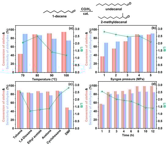 Additionally, the influence of reaction time (1–12 h) on the hydroformylation performance was investigated under conditions of 80 °C, 4 MPa syngas pressure, and toluene solvent, as illustrated in Figure 5d. The conversion of 1-decene gradually increased with prolonged reaction time, while the linear/branched aldehyde ratio progressively decreased. This phenomenon is attributed to the gradual participation of byproducts (2-decene and 3-decene) in hydroformylation at extended durations, leading to the formation of branched aldehydes and consequently reduced regioselectivity of the reaction.