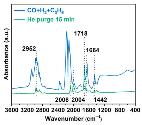 In situ Fourier transform infrared (FT-IR) spectroscopy revealed surface-adsorbed species on the catalyst during hydroformylation (as shown in Figure 6). After treating the catalyst with a syngas mixture (CO + H2 + C2H6) at 80 °C for 10 min followed by He purging, distinct absorption bands were identified: the peaks at 2952 cm−1 (C–H stretching), 1664 cm−1 (C = C stretching), and 1442 cm−1 (C–H scissoring) are assigned to adsorbed propylene [54]. The propylene molecules were stably adsorbed on the catalyst surface through π-bonding of the C = C double bond and weak interactions of the C–H bonds with Rh active sites. The incomplete desorption after He purging indicated strong adsorption, which may lead to the formation of surface intermediates. Two sharp peaks in the 2100–2200 cm−1 region, attributed to gaseous CO adsorption, gradually diminished and eventually disappeared after He purging. The bands at 2004 cm−1 and 2088 cm−1 are ascribed to Rh(CO)2 species, consistent with CO adsorption configurations, and the emergence of a peak at 1718 cm−1 corresponding to the C = O stretching vibration of an aldehyde group, coupled with the coexistence of Rh(CO)2 species, confirms that CO molecules insert into the Rh–alkyl bond to form aldehydes, aligning with the classical olefin–CO insertion mechanism of hydroformylation. These results indicate that, in addition to the atomically dispersed rhodium active sites, strong substrate adsorption may also be a contributing factor to the enhanced activity of the Rh/CTF-TPA catalyst in the hydroformylation reaction.