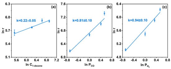 Kinetic reaction order to (a) 1-decene, (b) CO, and (c) H2 in the hydroformylation of 1-decene over Rh/CTF-TPA catalysts. The error bars in the figures show the differences between the three measurements.