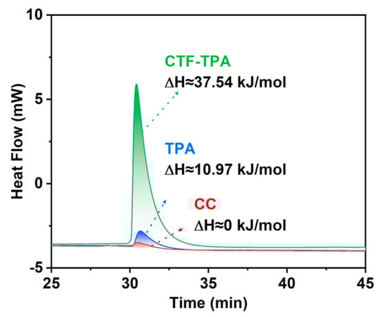 To gain deeper insights into the adsorption characteristics of catalyst surfaces toward olefins, propylene was employed as a probe molecule to quantitatively analyze the thermodynamic behavior of polymeric monomers (CC and TPA) and the CTF-TPA support using differential scanning calorimetry (DSC). As shown Figure 8, the results indicated that CC exhibited negligible adsorption behavior towards propylene. The adsorption enthalpy of TPA towards propylene was merely ∆H ≈ 10.97 kJ/mol, while the adsorption enthalpy of the CTF-TPA carrier, formed via polymerization, was significantly enhanced to ∆H ≈ 37.54 kJ/mol. This marked disparity in adsorption free energy underscores the critical role of the polymeric framework in facilitating specific interactions with olefin molecules. The thermodynamic data, in conjunction with the close-to-zero reaction kinetics for olefin concentration observed in previous kinetic studies, collectively confirm that the microstructure of the polymeric catalyst facilitates the formation of dynamic olefin-enriched zones near active sites, thereby enhancing hydroformylation activity.