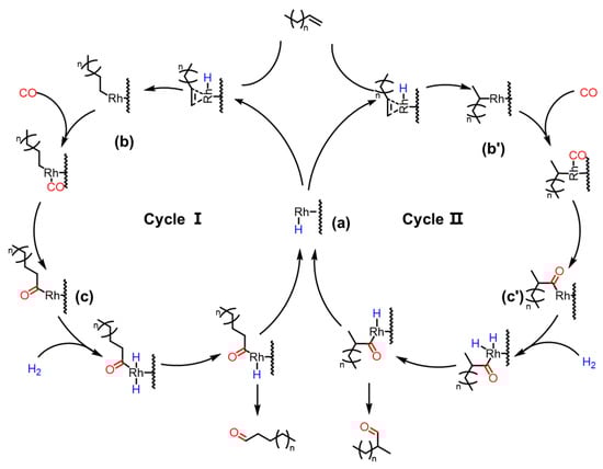 The reaction pathway of olefin hydroformylation to aldehydes on Rh/CTF-TPA, where (a) represents the [RhH(CO)xLy] active center; (b,b′) represent alkyl–rhodium intermediates; (c,c′) represent acyl–rhodium species.