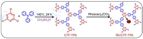 Synthesis of CTF-TPA via a liquid-phase Friedel–Crafts alkylation reaction of cyanuric chloride with triphenylamine catalyzed by methanesulfonic acid, followed by the preparation of Rh/CTF-TPA catalyst through rhodium loading.