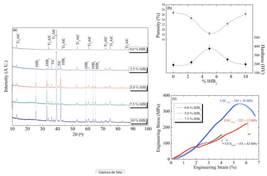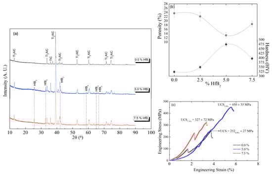 Figure 2c displays the stress (σ) vs. strain (ε) curves in engineering format for the Ti2AlC/xHfB2 composites heat-treated at 1200 °C for 30 min. These results are consistent with the previously mentioned hardness and porosity values. The highest ultimate compressive strength (UCS) of ~345 MPa is that of the Ti2AlC/5HfB2 composite, while the intermediate UCS (~225 MPa) corresponds to the Ti2AlC/7.5HfB2 composite. The lowest UCS (~153 MPa) is that of the composite without the HfB2, demonstrating the strengthening effect of this dopant up to 5 wt.%.