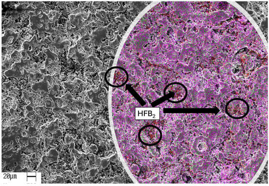 Energy-dispersive spectroscopy (EDS) analysis has revealed the elemental distribution, as shown in Figure 1. As expected, Ti and Al are the dominant elements. It should be noted that C quantification is not precise due to low spectral energy. Figure 1 also shows a more uniform distribution of the HfB2 spheroid-like particles, which appears closely related to the observed porosity level. This seems to be intimately associated with the porosity level attained. The absence of interfacial microcracking suggests good compatibility between the Ti2AlC matrix and HfB2 reinforcement.